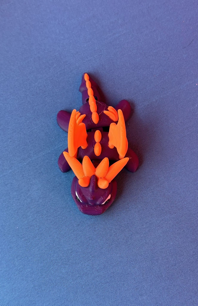 Flying in from your favourite fantasy is our 3D printed mini dragon in striking purple and orange hues. Crafted with attention to detail, this whimsical accessory is perfect for fantasy enthusiasts and collectors. Made from durable materials, this mini dragon is a unique addition to any shelf, desk, or display case. Its vibrant colors and intricate design make it a standout piece that adds a touch of magic to any space. Ideal for gifting or personal enjoyment, this mini dragon is sure to spark joy and admiration wherever it is placed. Upgrade your decor with this charming and eye-catching creation today!